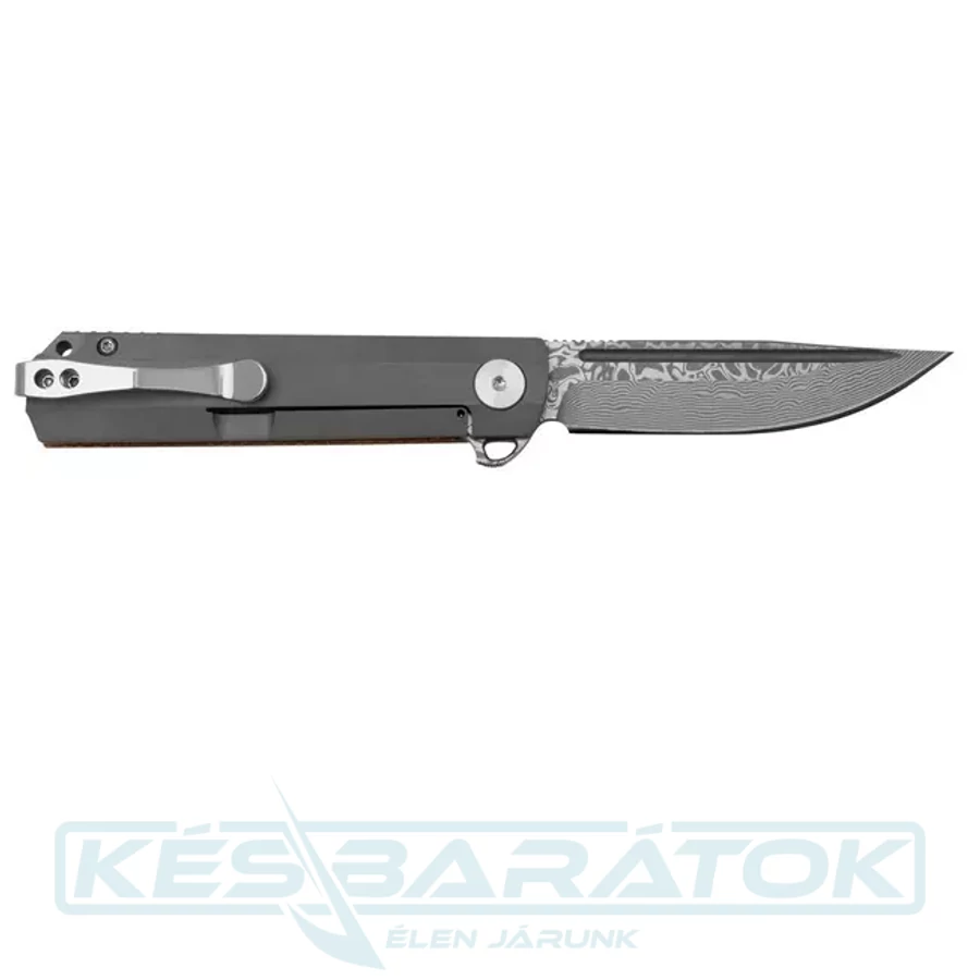 A penge egy 110 rétegű damaszk acél masszív horonnyal. Az egykezes nyitást flipper és golyóscsapágy segíti.