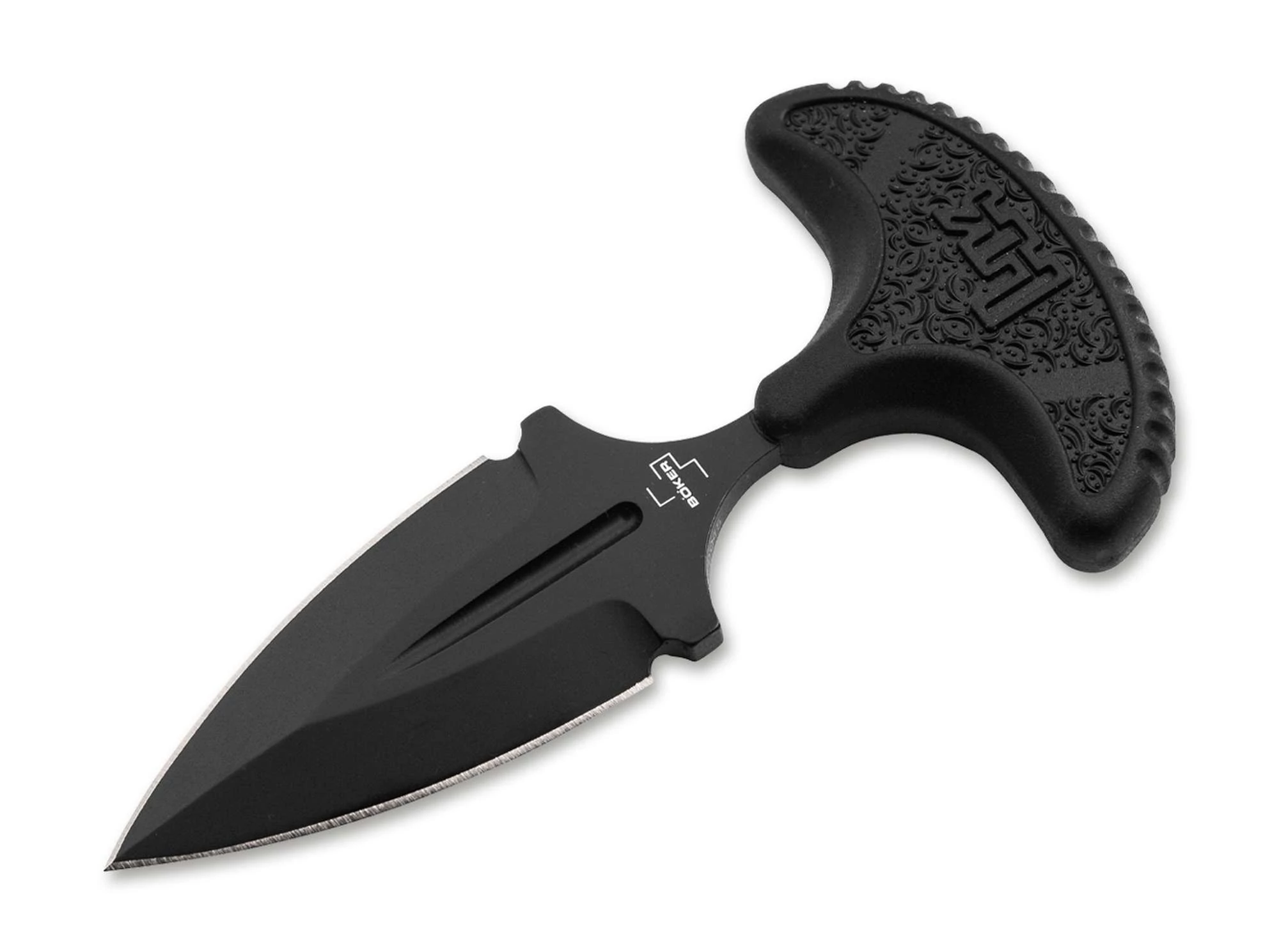 A Heckler & Koch FX02 kompakt, klasszikus tőrje a tökéletes "utolsó menedéknek" tervezett eszköz extrém, nagy stresszel járó helyzetekre. A kétélű penge tartós D2 acélból készült, fekete titánbevonattal a tükröződésmentesség érdekében. A szimmetrikus, elpusztíthatatlan FRN-ből készült markolat minden körülmények között megbízható irányítást biztosít. Az optimális fogás érdekében a felület a legújabb HK mintázattal texturált. Kydex tokkal.
