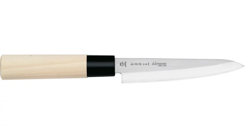 Sokoldalú általános kis konyhai kés, kiválóan alkalmas apró alapanyagok vágására. Miniatür Gyuto kés, könnyen kezelhető, nagyszerű gyümölcs- vagy zöldséghéj, például citrom és alma hámozására vagy dekoratív vágására. Rozsdaállóság tekintetében listavezető (420JS, HRC 54-56), gyártáskor nagy figyelmet fordítanak a rozsdamentes acél típusára, markolata cseresznye, juhar. A Seki evőeszközök nem csak Japánban, hanem a tengerentúlon is híresek, az erős és precíz késeket egytől egyig japán kézművesek készítik.